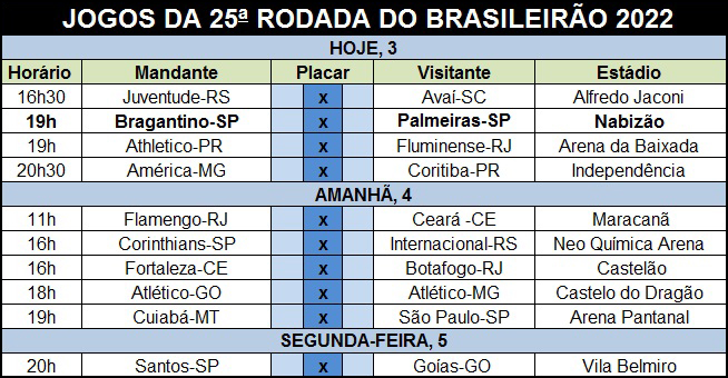 O confronto deste sábado contra o Palmeiras está marcado para as 19h, no Estádio Nabizão, em Bragança Paulista, e será válido pela 25ª rodada.