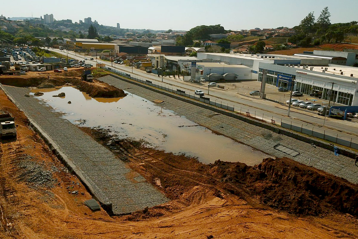 Os serviços totais contemplam a construção de bacia de retenção (o piscinão), construção de ala para galeria, gabião colchão, gabião caixa na bacia e pavimentação completa.