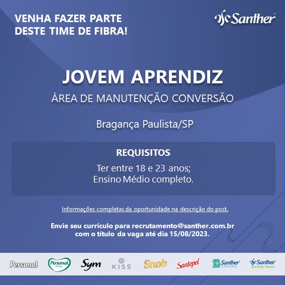 A empresa Santher, líder na fabricação de bens de consumo, está atualmente à procura de Jovens Aprendizes interessados em dar os primeiros passos no mercado de trabalho, através do programa de aprendizagem oferecido pela empresa. A oportunidade é voltada para a área de Manutenção Conversão, na fábrica localizada na cidade de Bragança Paulista, interior de São Paulo.