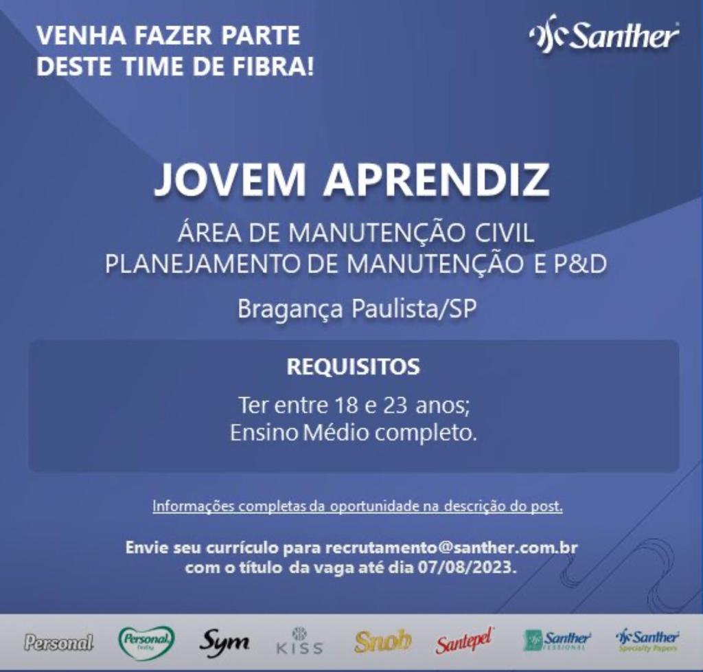 A Santher, empresa líder na fabricação de bens de consumo, está oferecendo uma excelente oportunidade de emprego para JOVEM APRENDIZ, na Área de Manutenção Civil, Planejamento de Manutenção e P&D, em sua fábrica na cidade de Bragança Paulista, interior de São Paulo.