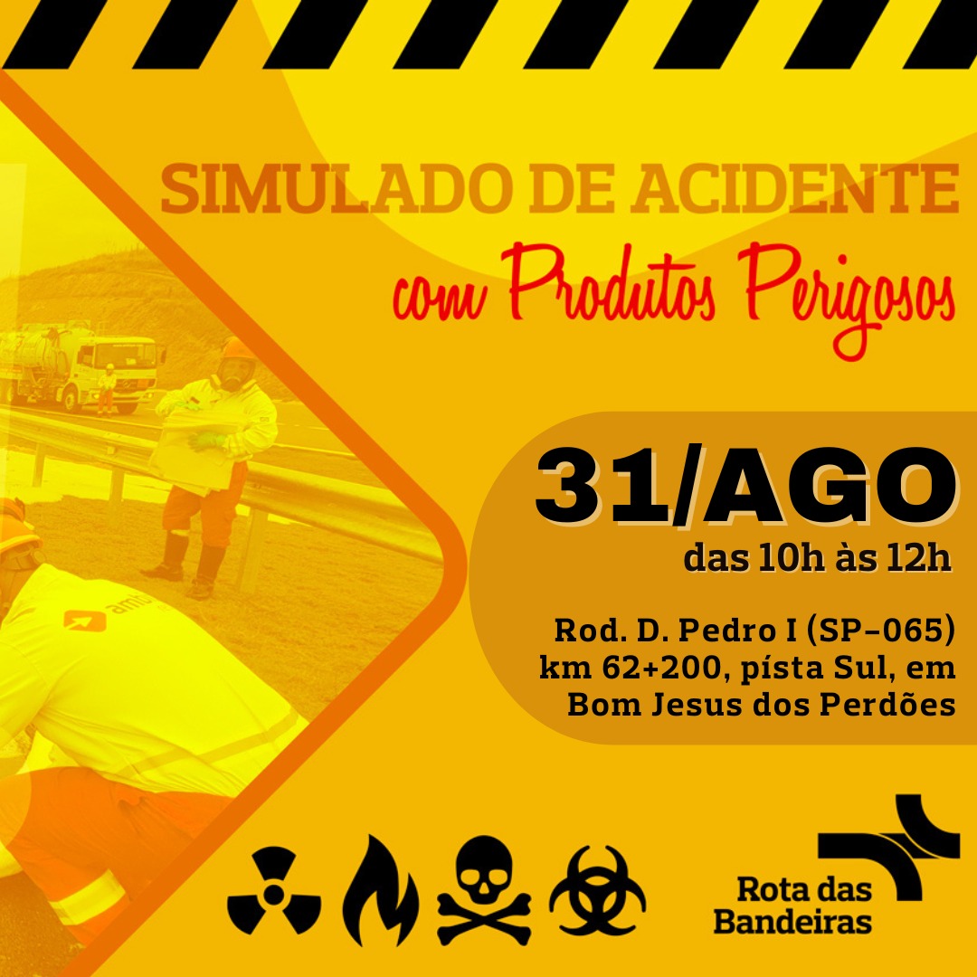 Nesta quinta-feira, dia 31 de agosto, o Serviço de Atendimento Móvel de Urgência (SAMU) Regional de Bragança Paulista participará de um simulado de acidente com produto perigoso, promovido pela Concessionária Rota das Bandeiras S.A. O treinamento ocorrerá das 10h às 12h, na marginal Bom Jesus, localizada no km 62+200 da Rodovia D Pedro I (SP-065), pista sul (sentido Jacareí).