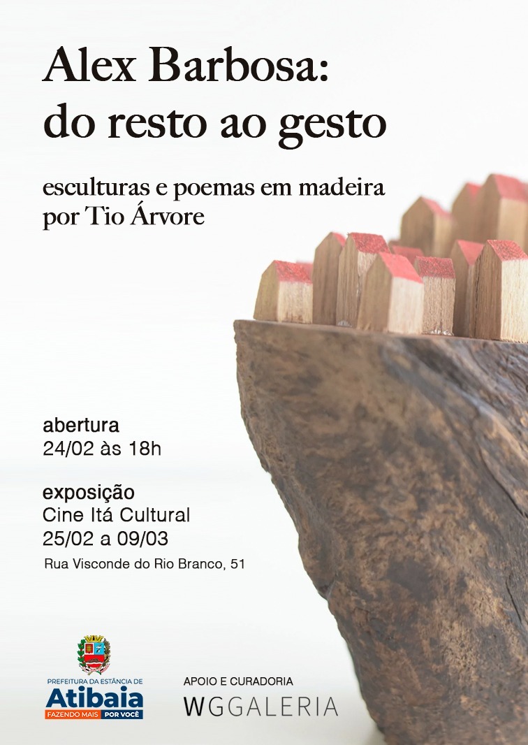 O Cine Itá Cultural de Atibaia recebe, a partir deste sábado, 24, às 18h, a exposição individual “Do resto ao gesto”, do artista e poeta Alex Barbosa, em cartaz até o dia 9 de março. O Itá Cultural fica na Rua Visconde de Rio Branco, 51, no centro de Atibaia. A entrada é gratuita.