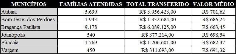 Em setembro, o valor total do repasse do governo às 46 cidades da região chega a pouco mais de R$ 123,7 milhões, sendo assim, o valor médio dos repasses por famílias na região é de R$ 683,27. Já no país, o valor médio é semelhante a R$ 686,89.