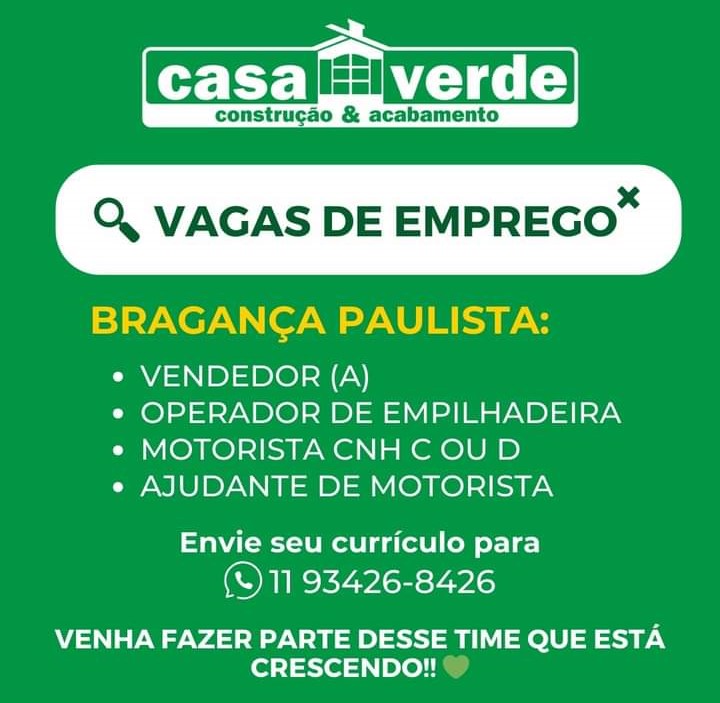 À tarde, a partir das 14h, será a vez da empresa Casa Verde Construção e Acabamento realizar entrevistas para as vagas de Vendedor(a), Operador de Empilhadeira, Motorista CNH C ou D e Ajudante de Motorista. Interessados podem enviar seu currículo para (11) 9 3426-8426.