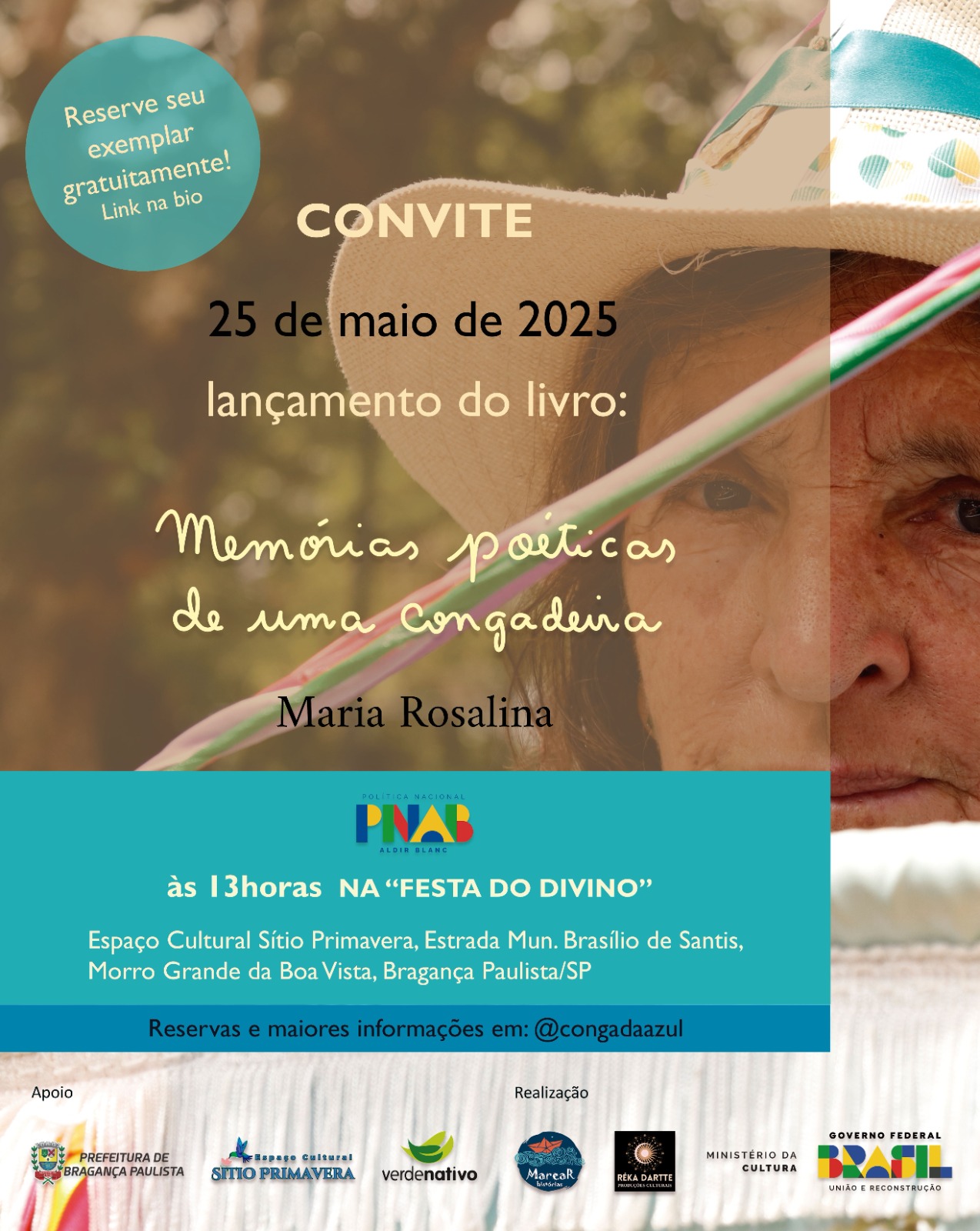 É com grande prazer e alegria que as produtoras culturais Jussara Reis e Réka Dartte anunciam o lançamento do livro “Memórias Poéticas de uma Congadeira”, de autoria da mestra Maria Rosalina, figura importante da cultura popular da Região Bragantina.