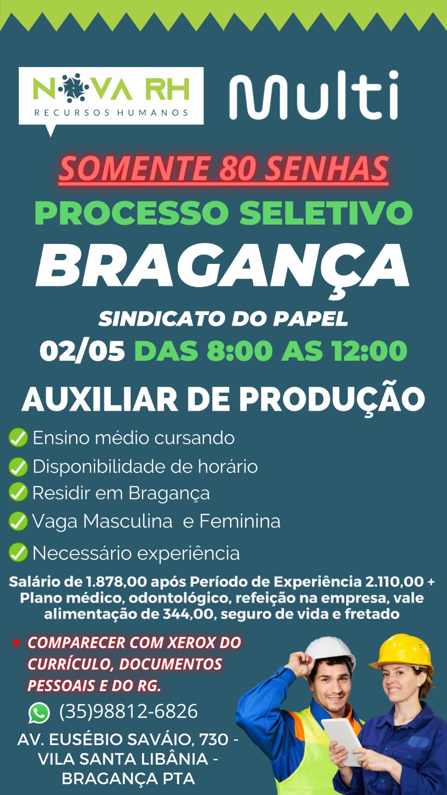 A Agência Nova RH - Recursos Humanos, em parceria com o Sindicato do Papel de Bragança Paulista, através do presidente Antônio Bugalu, está oferecendo oportunidades de emprego para a população local e da região. Nesta quinta-feira, 2 de maio, das 8h às 12h, a empresa Multilaser Blue (Grupo Multi) realizará uma "Mega Seleção" com entrevistas para preencher 30 vagas de trabalho de Auxiliar de Produção, destinadas a homens e mulheres.