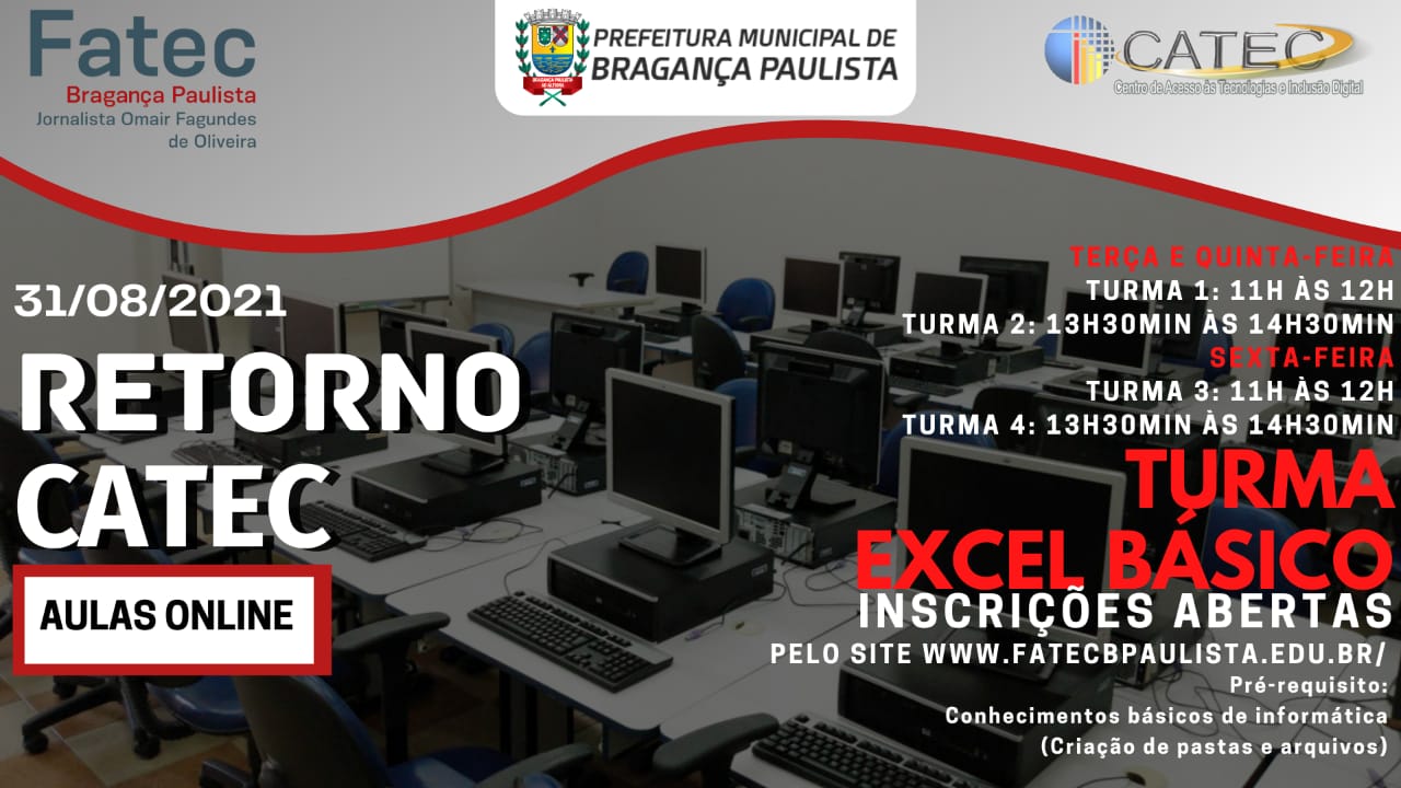 A Prefeitura de Bragança Paulista, por meio da Secretaria de Governo, Desenvolvimento Econômico e Inovação, e a Fatec Jornalista Omair Fagundes de Oliveira retomaram a parceria do projeto de inclusão digital Catec (Centro de Acesso à Tecnologia), que estava paralisada desde o ano passado em virtude da pandemia. Neste momento, estão abertas as inscrições para os cursos on-line e gratuitos de Excel Básico e de Tecnologia para apoio ao Comércio.