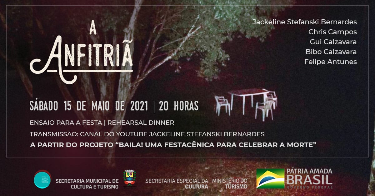 Também neste sábado, 15, às 20h, pelo YouTube acontece a exibição do projeto “A Anfitriã”, cuja sinopse explica: “A anfitriã deseja uma festa. A mestre de cerimônias responsável pelo evento marca, então, um ensaio para essa festa - um rehearsal dinner - e conta com a ajuda de um assistente e de um baterista para a preparação dessa noite especial. Não é possível realizar o ensaio no local de sua realização, tampouco é possível que estejam equipe, Anfitriã e convidados mais importantes presentes. A canção final toma o espaço, uma ventania derruba cadeiras de plástico brancas, taças de cristal se estilhaçam, bexigas estouram.Muito em breve nos encontraremos: vamos beber das mesmas taças, beijar demoradamente o rosto de quem amamos e aos poucos quase esquecer de tudo isso. Muito em breve, nos encontraremos” O link da transmissão online é: https://youtu.be/xdUiEkAv60I.