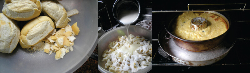Coloque numa tigela os pães cortados, misture o açúcar, o queijo ralado, as uvas passas e as especiarias. Sobre estes secos, vá colocando os ovos batidos alternando com o leite quente (não coloque todo o leite de uma vez, pode ser que não use tudo para umedecer) e vá mexendo com uma colher de pau até os pedaços de pão amolecerem e se transformarem numa massa. Deixe a massa descansar para amolecer os pães enquanto prepara a calda de caramelo.