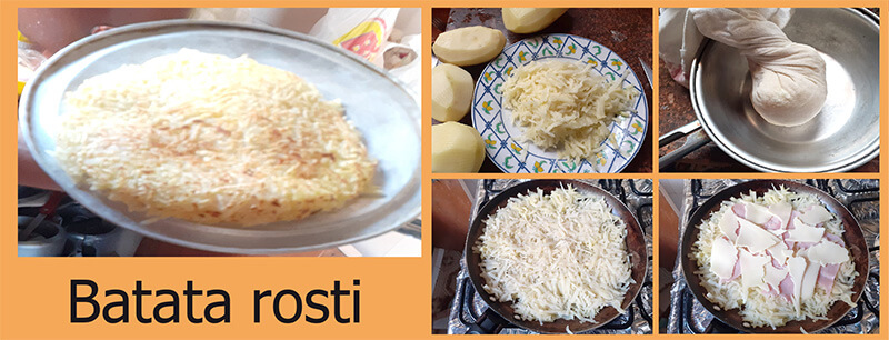 Para quem não sabe do que se trata, a batata rosti é preparada à base de batatas cruas (ou ligeiramente cozidas), raladas no ralo grosso (daquele tipo de batata palha). Segundo pesquisei, tem origem no Cantão de Berna, a capital da Suíça, e é um prato originalmente preparado por fazendeiros da parte alemã do país (onde se falava prioritariamente alemão), como uma iguaria de café da manhã, e se popularizou no Brasil por influência dos imigrantes que se instalaram na primeira colônia suíça em solo brasileiro. Chamada de Nova Friburgo, a colônia foi fundada em 1818, no estado do Rio de Janeiro.