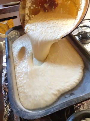 Prepare uma assadeira pequena untada com óleo e farinha de trigo ou fubá e despeje a massa, levando assar em forno pré-aquecido a 180º C por cerca de 25 a 30 minutos ou até dourar nas bordas.