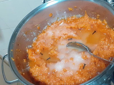 A dificuldade desses doces antigos é que, até apurar, ou seja, chegar no ponto certo de cozimento, tem de secar a água da abóbora e, até lá, fica pulando para fora da panela a água melada, sujando fogão, chão e parede.