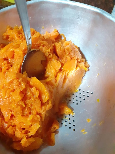 Com esta técnica, o cozimento da abóbora é feito na panela de pressão, depois a escorremos no escorredor de macarrão (tive o cuidado de medir a quantidade de água que dois quilos de abóbora resultaram: foi 350 ml) e, depois de bem seca e já desmanchando, é que finalizamos o processo.