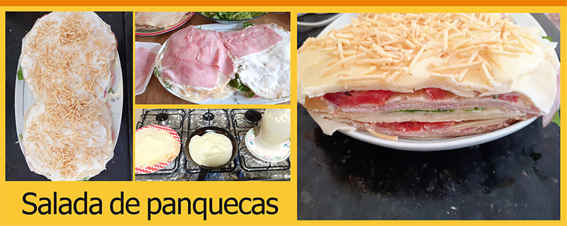 Aí, a saída é fazer uma salada de panquecas, em travessa, que é mais rápida de preparar e não resseca, além de ser nutritiva, gostosa e podemos fazer as panquecas de véspera para montar no dia seguinte. E a salada dura até dois dias na geladeira depois de pronta, coberta com plástico filme.