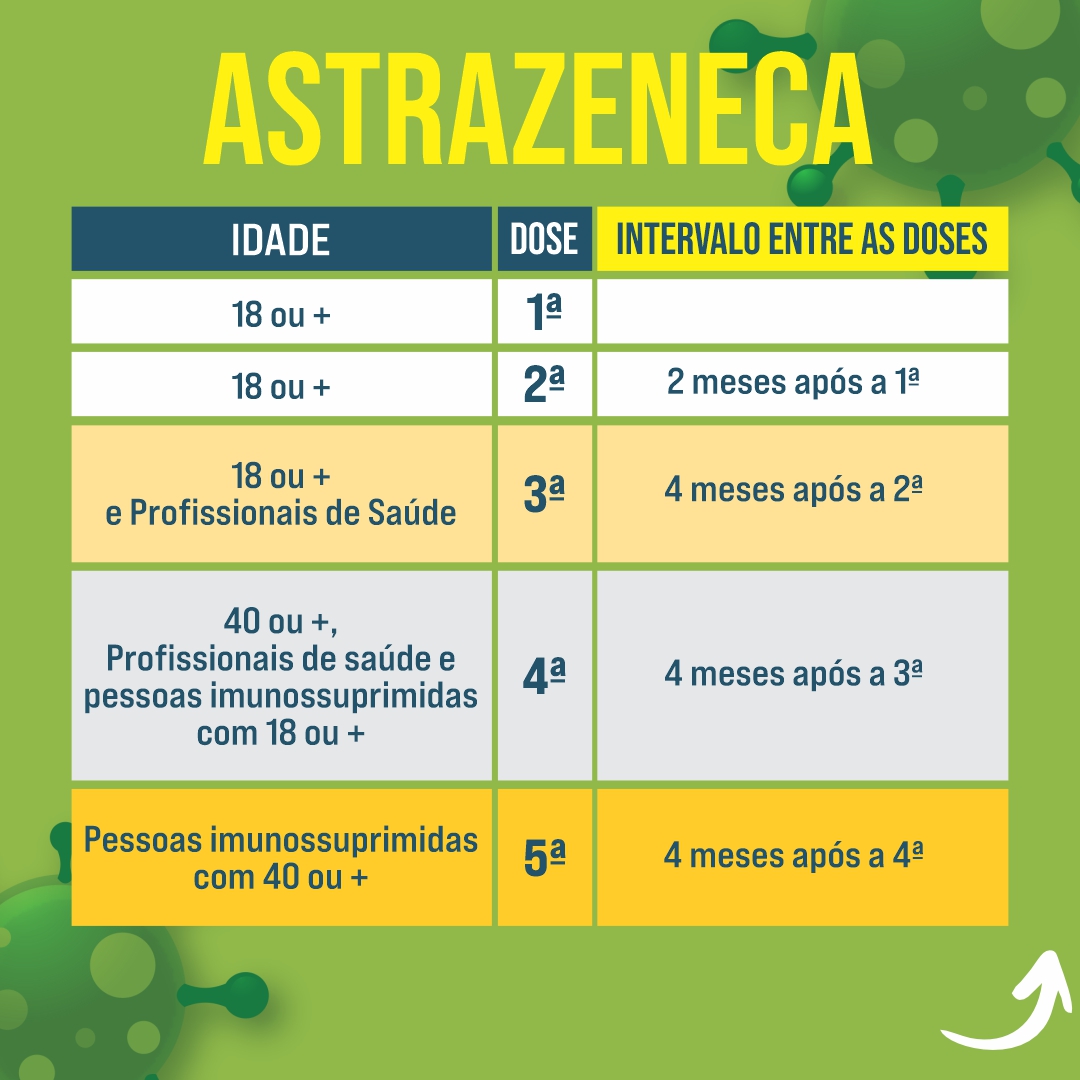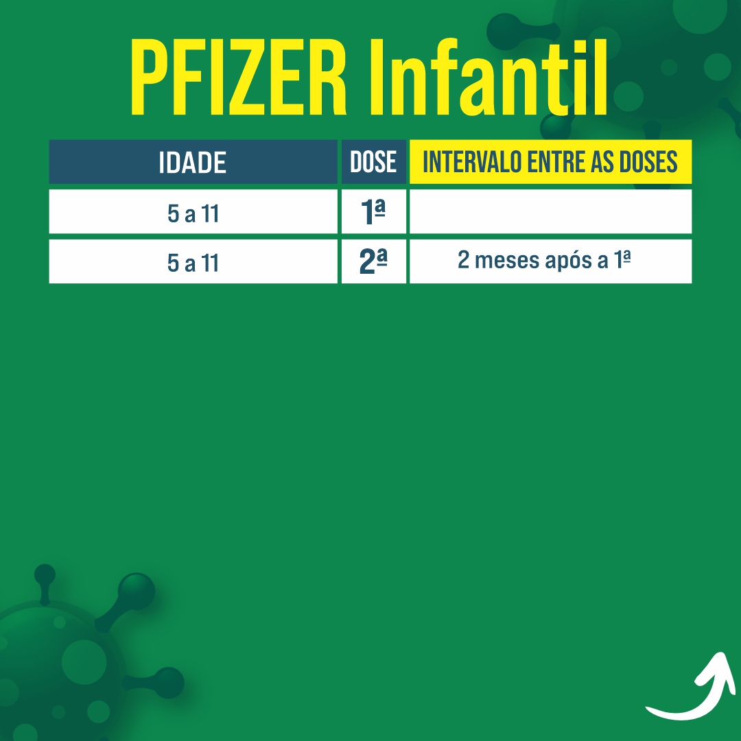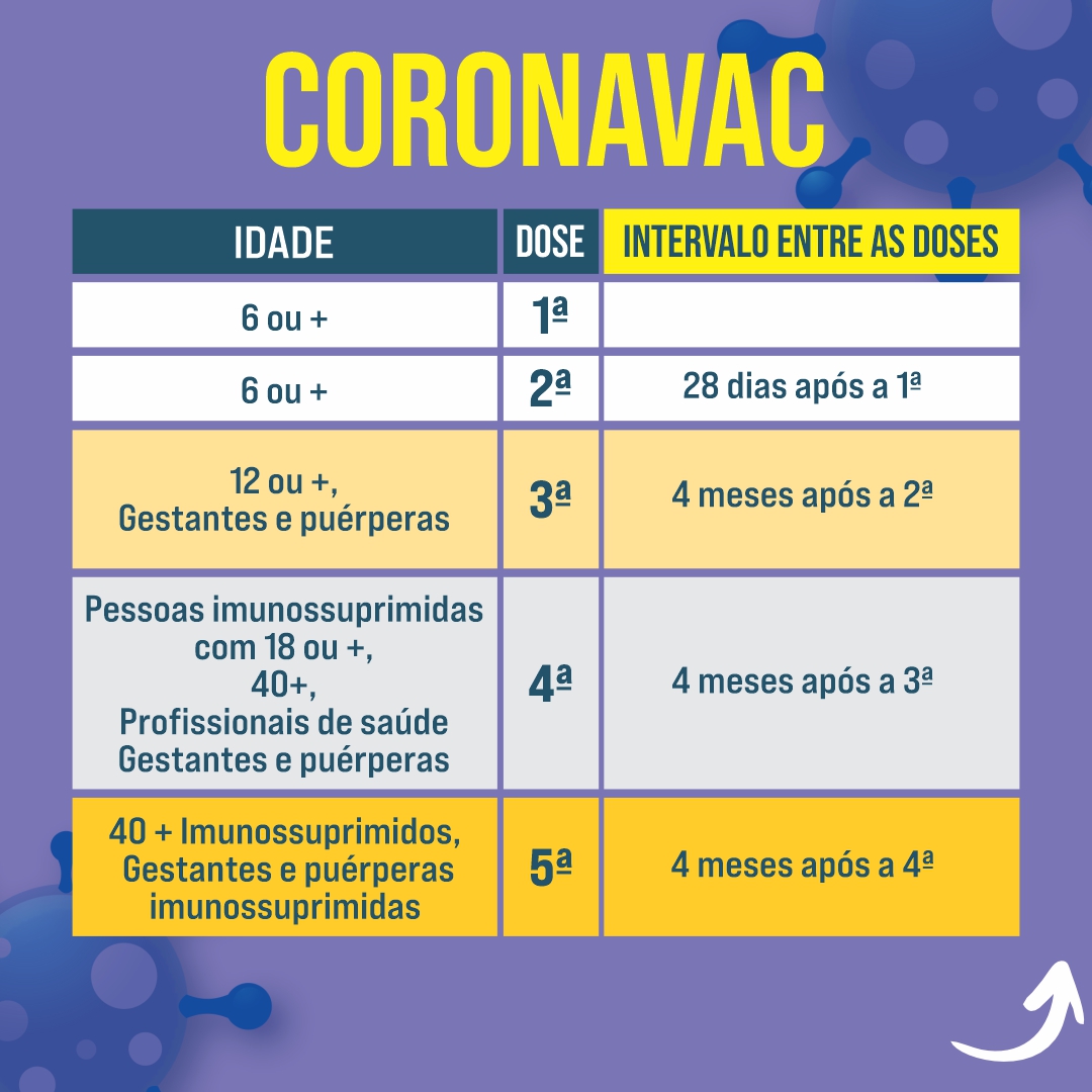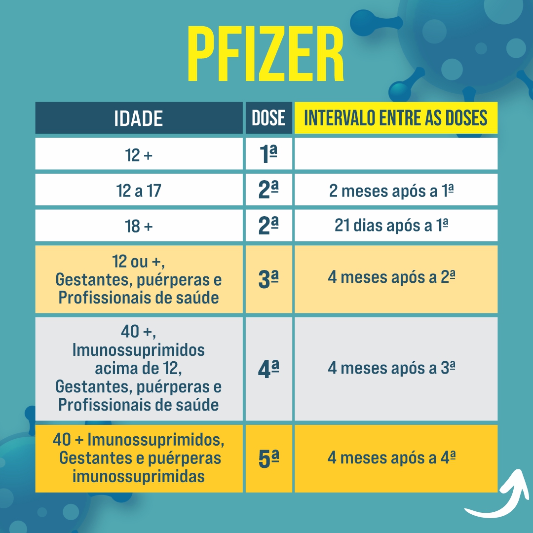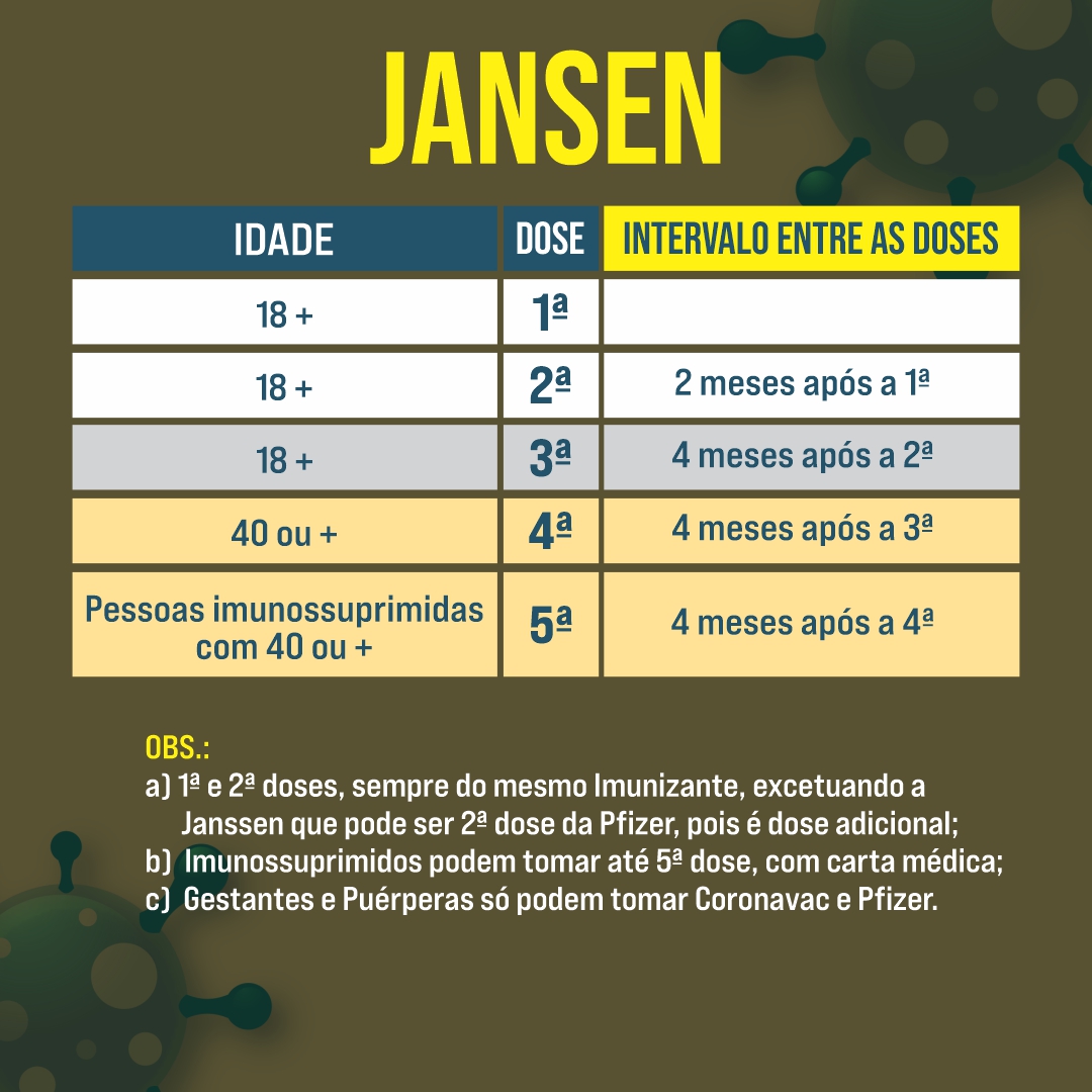 As tabelas, onde constam idade, dose e intervalo entre as doses, são para os imunizantes disponíveis na rede municipal de saúde, são eles: Pfizer, Janssen, Coronavac e Astrazeneca. Todas as vacinas são seguras e aprovadas pela Agência Nacional de Vigilância Sanitária – Anvisa.