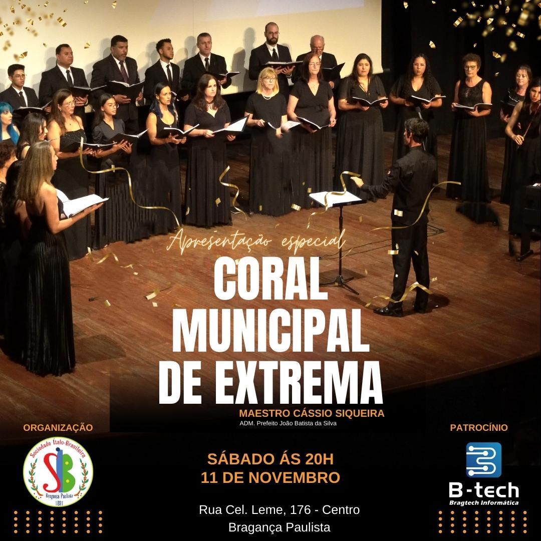 Após o sucesso da tradicional "Serata Italiana", realizada no final de outubro com a participação do Grupo Musicando, a Sociedade Ítalo-Brasileira de Bragança Paulista está preparando mais um grande evento para o mês de novembro. No próximo sábado, 11, a Associação receberá uma apresentação especial do Coral Municipal de Extrema, sob a regência do Maestro Cássio Siqueira. O evento é gratuito e conta com a organização da Sociedade Ítalo-Brasileira de Bragança Paulista e o patrocínio da B-Tech – Informática. A sede da SIB está localizada na Rua Coronel Leme, 176, no Centro de Bragança.
