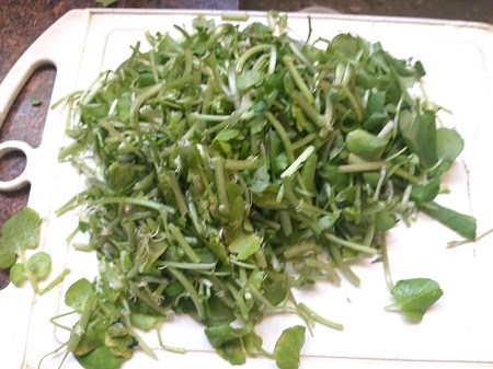 Prepare os talos do agrião picando em pedaços de cerca de 1 a 2 cm e reserve.
