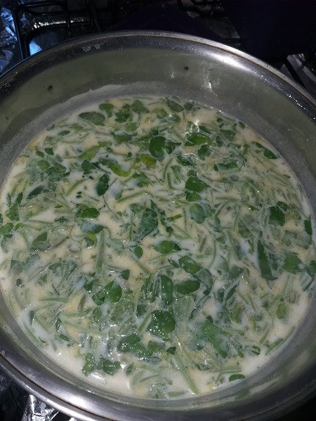 Coloque sobre a cebola o leite, misture e depois junte a água com a farinha dissolvida e mexa bem para que todos os sabores se misturem.