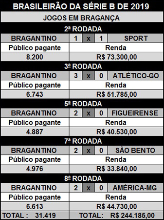 Nos cinco jogos realizados em Bragança Paulista neste ano, pelo Campeonato Brasileiro da Série B, o Bragantino acumula um público total de 31.419 pagantes, sendo que, por jogo, a média de público no Marcelão supera os seis mil torcedores.